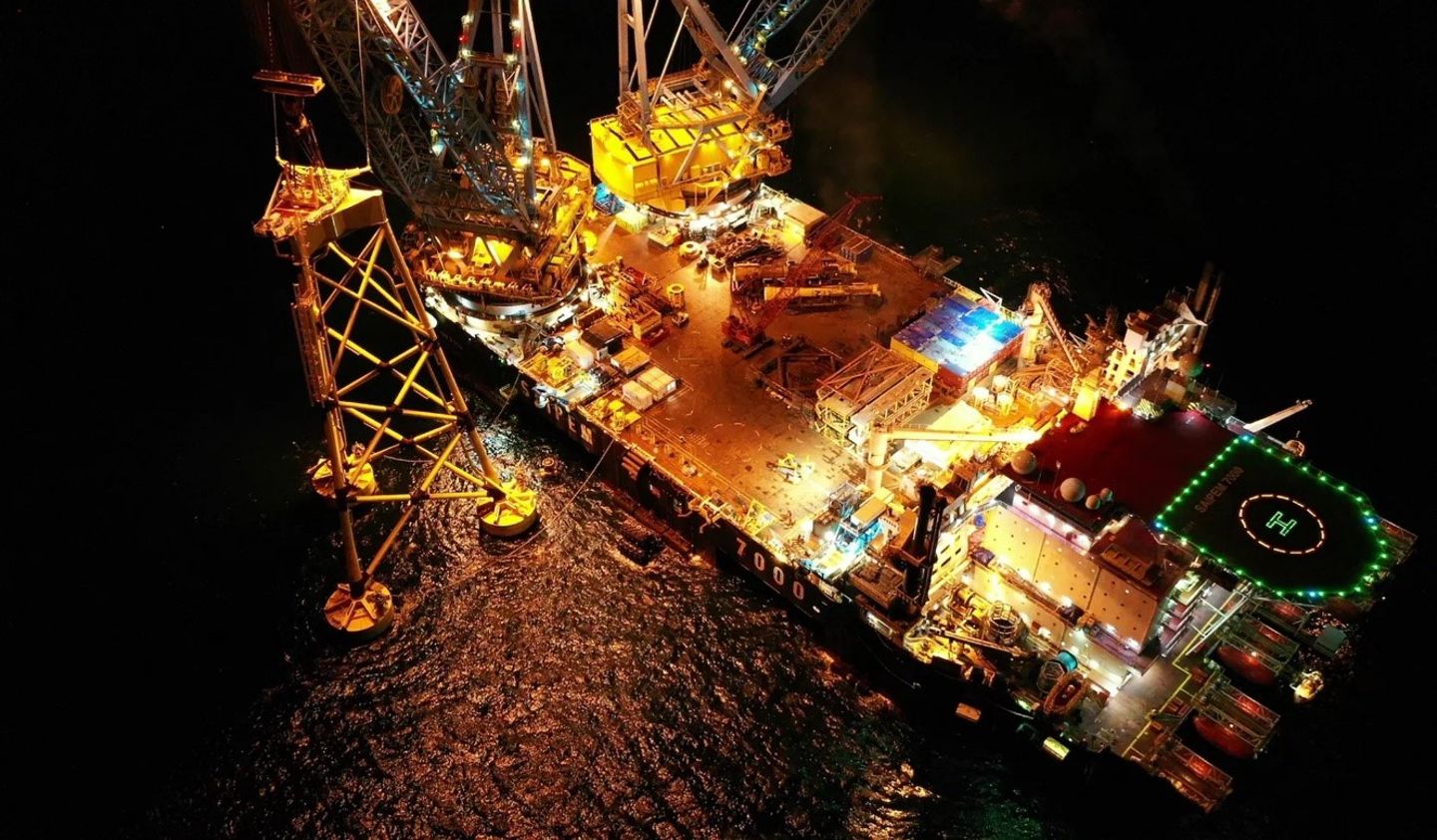 Med en gigantisk kran på en lekter ble et stålunderstell med bøttefundamenter heist på plass i vindparken Seagreen utenfor kysten av Skottland. ( Foto: Seagreen Wind Energy LTD)