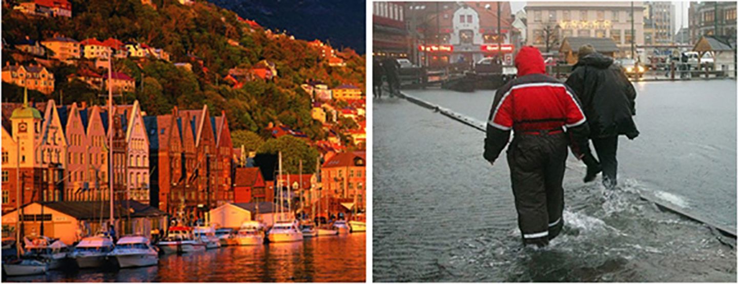 Thus there is great deal of acceptance for the weather. However, the impacts of climate change and severe storm events are contributing to the risk of flooding, landslides and urban run-off. This presents challenges for preserving Bergen's cultural heritage including the wooden Hanseatic buildings situated at Bryggen (UNESCO World Heritage Site) as well as challenges for maintaining Bergen's economic livelihood.