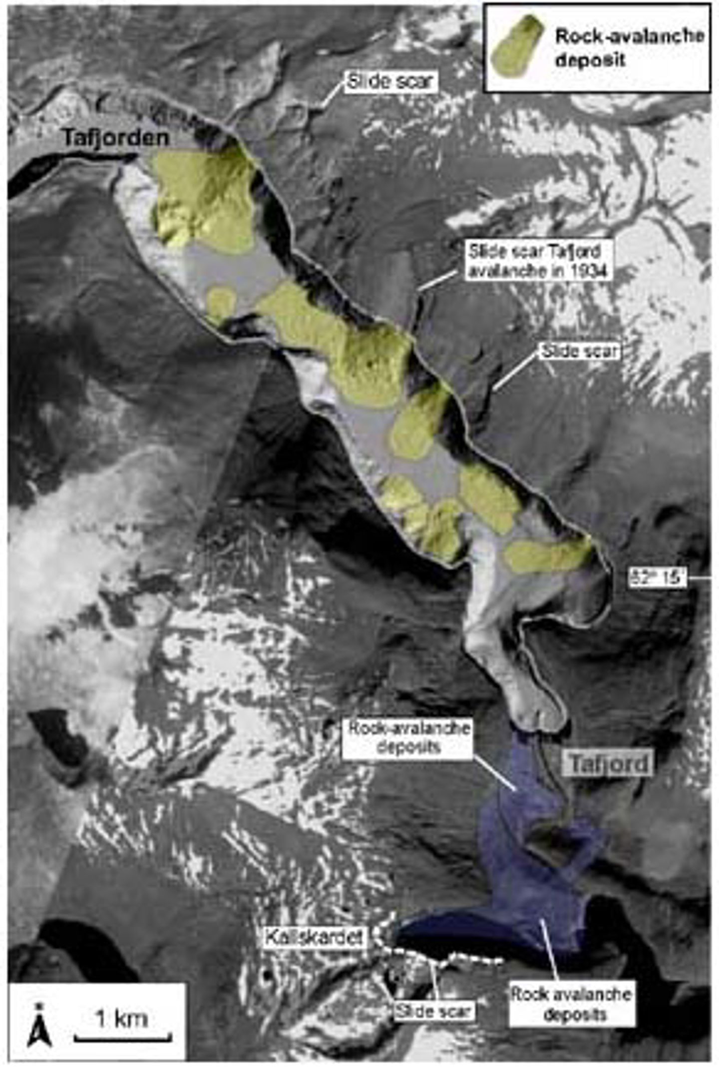 Satellite data and swath bathymetry from Tafjord, showing the location of rock-avalanche deposits onshore and in the fjord