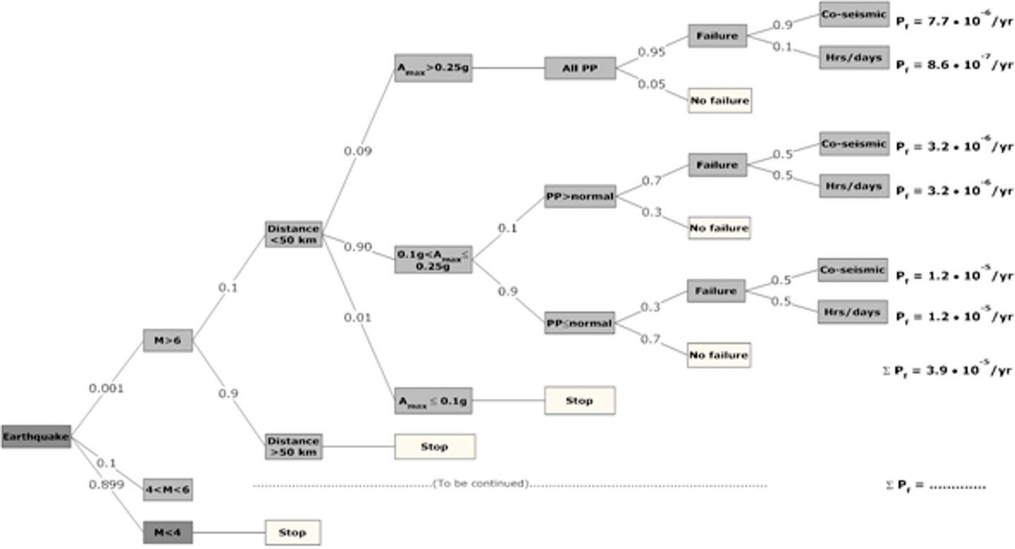 For simplicity, the steps for the event tree in Figure 8 (seismic trigger) are only shown for an earthquake magnitude of 6. Earthquake magnitude (M) of 4 and M between 4 and 6 are treated similarly to magnitude 6, but the probability estimates differ.