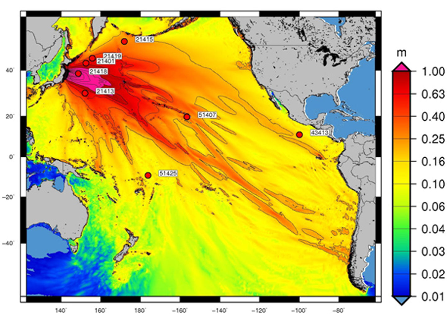 The tsunami generated by the Tohoku earthquake 11. March 2011. Maximum surface elevation in meters.