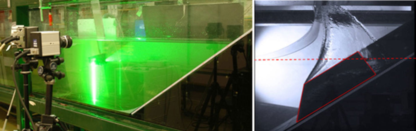 From laboratory experiments where the generation of the tsunami after a potential slide from Åknes is modelled. On the left is shown the wave tank and a snapshot after the front of the slide has impacted the water (right).
