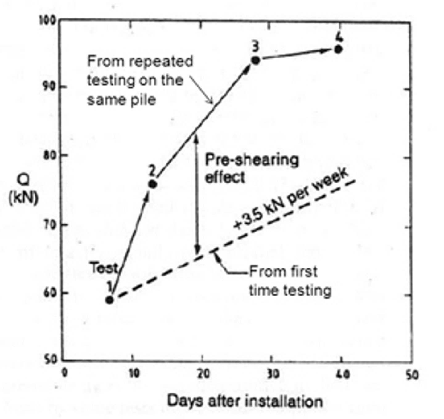 Present knowledge about time effects in clays is that the capacity may increase by 10-50% within 1-2 years after installation and to 50-200 % after 10 years.