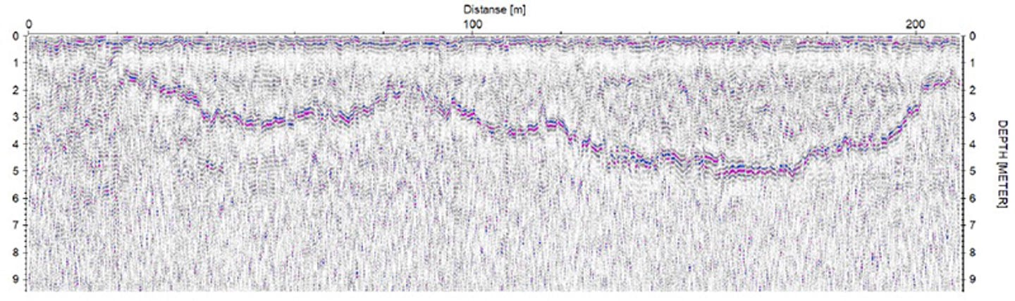 Radargram fra et myrområde i Sør-Norge. Det ble observert berg i hver ende av profilet (granittisk gneis), og reflektoren som er synlig igjennom profilet tolkes som overgangen til berg/faste masser. Hastigheten i løsmassene er anslått ut fra myras ledningsevne og permittivitet.