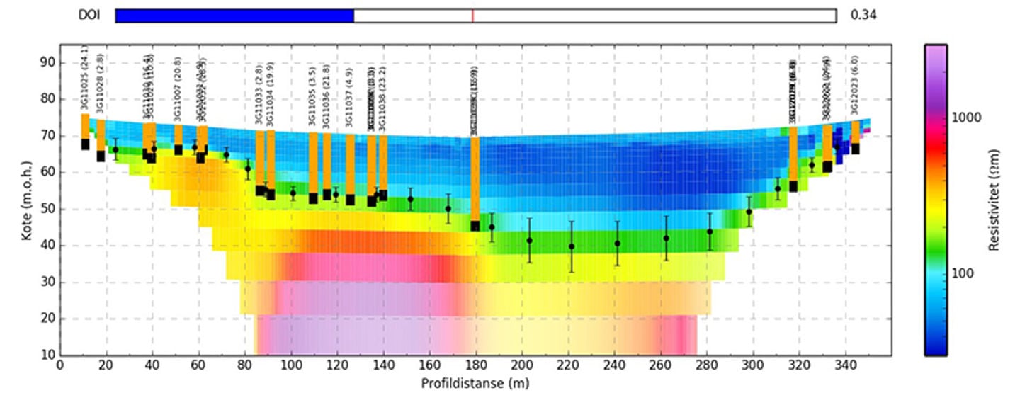 Eksempel på ERT-målinger fra et jorde på Ringerike og totalsonderinger utført i nærheten av profilet. Med kun to-tre boringer kan man velge en terskelverdi for f.eks. bergflaten og tolke denne (svarte punkter). Målingene gir også kontinuerlig informasjon i berget, og man ser tydelig trappetrinnsformasjonen fra de lagdelte kambro-silur-bergartene.