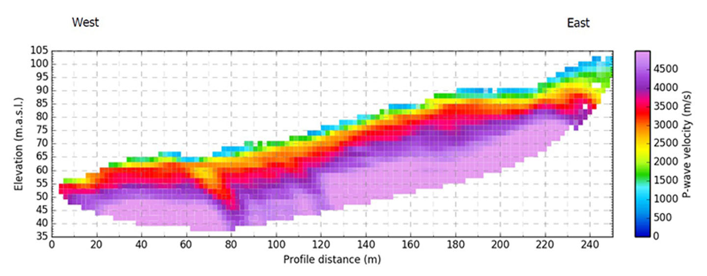 Eksempel på tomografisk inversjon av refraksjonsseismiske data. Profilet indikerer en sone med forvitret berg ved 80 m, som kan være en svakhetssone.