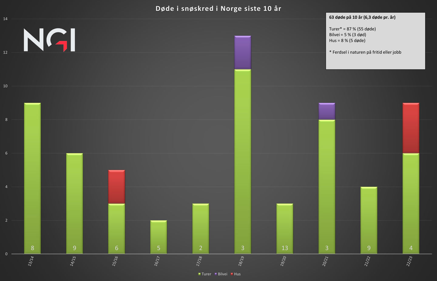 Siden 1972 har NGI ført statistikk og undersøkt mange av snøskredene med omkomne i Norge. På oppdrag av lokale politimyndigheter eller andre med ansvar for sikkerhet bistår NGI ved akutte snøskredhendelser.